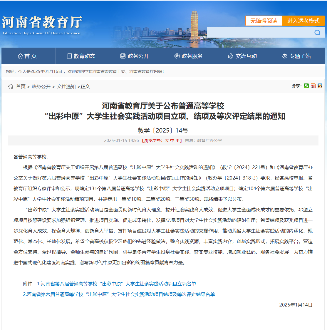 日前,河南省教育厅官网公布《河南省教育厅关于公布普通高等学校“出彩中原”大学生社会实践活动项目立项、结项及等次评定结果的通知》教学〔2025〕14号。我院申报的《唤醒文物记忆·讲好中国故事——用中华优秀文化涵育青年文化自信的路径探析》项目成功立项。