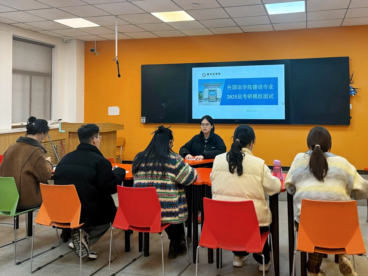 2025年3月6日下午16点至19点,我院德语专业全体教师在W117教室为2025届德语专业进入考研复试的学生组织了一场沉浸式的考研复试模拟。此次模拟复试旨在帮助学生提前熟悉考研复试流程,提升应试能力,并为即将到来的考研复试做好充分准备。
