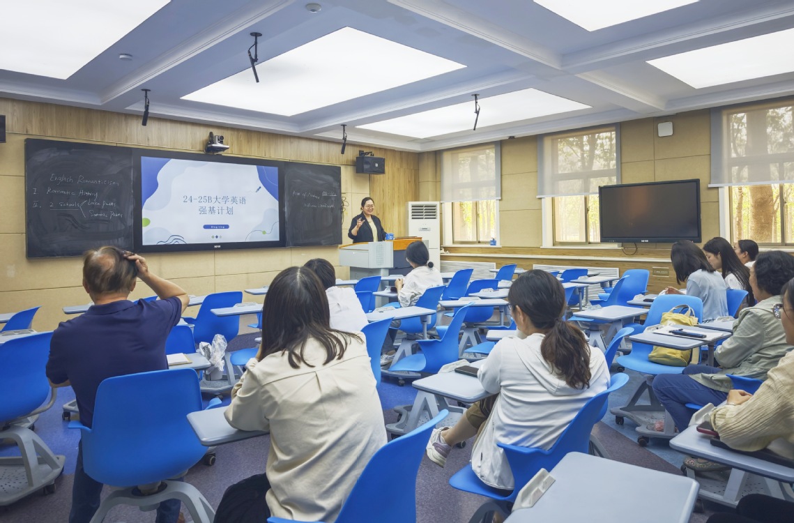 本学期大学英语强基课程报告会于5月13日下午在W104顺利举行。本次会议由宣菡静主任主持,丁玲老师主讲,旨在总结本学期强基课程的开展情况以及经验总结。