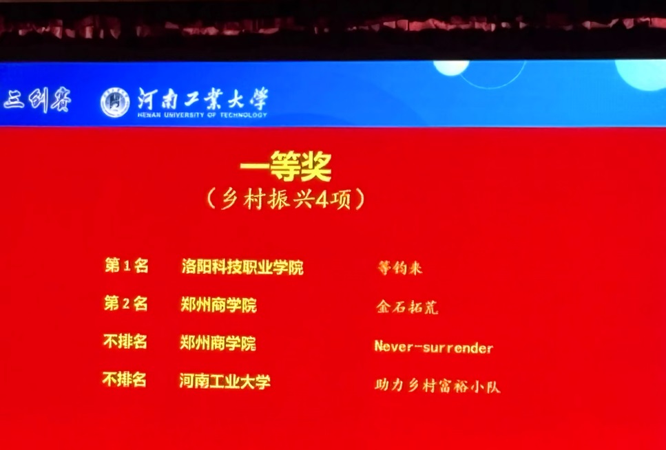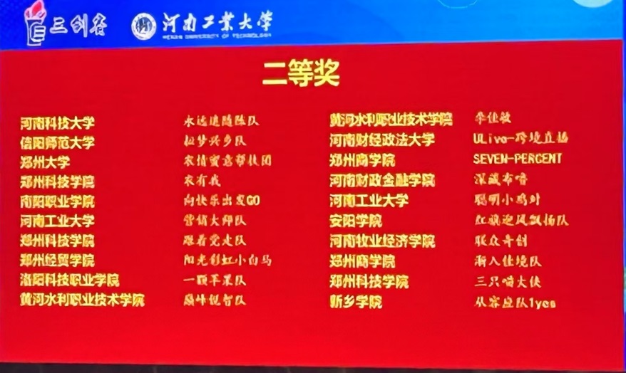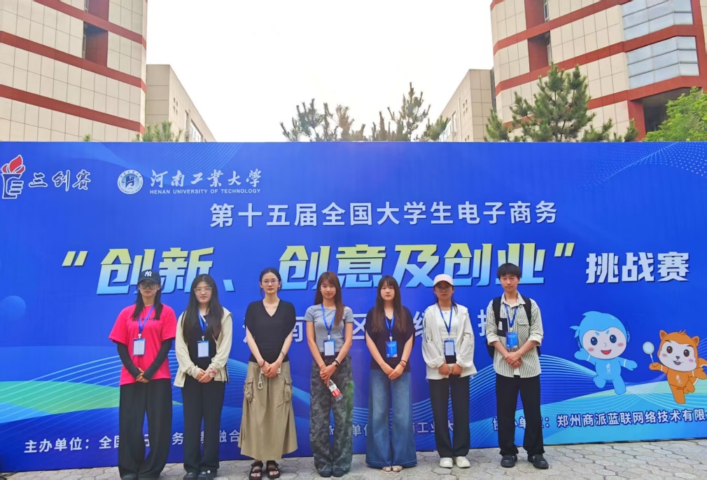 2025年5月16日-18日,第十五届全国大学生电子商务“创新、创意及创业”挑战赛(以下简称“三创赛”)河南省级选拔赛在河南工业大学举行。我院23级商务英语专业学生张默涵、张慧卓、张家辉、李米霖组建的金石“拓”荒团队(指导教师:王玉、李真真)斩获乡村振兴赛道一等奖、最佳创新奖、最佳创意奖;23级商务英语专业学生王敏、关亚格、姜幸言、李冰洁、丁则瑞组建的Never-surrender团队(指导教师:张姗姗、段田园)斩获乡村振兴赛道一等奖;22级商务英语专业学生杨新冉、牛仪茜、吴沛霖、刘玉琳、王志杰组建的Sevenpercent团队(指导教师:李真真、王玉)斩获跨境电商赛道二等奖。