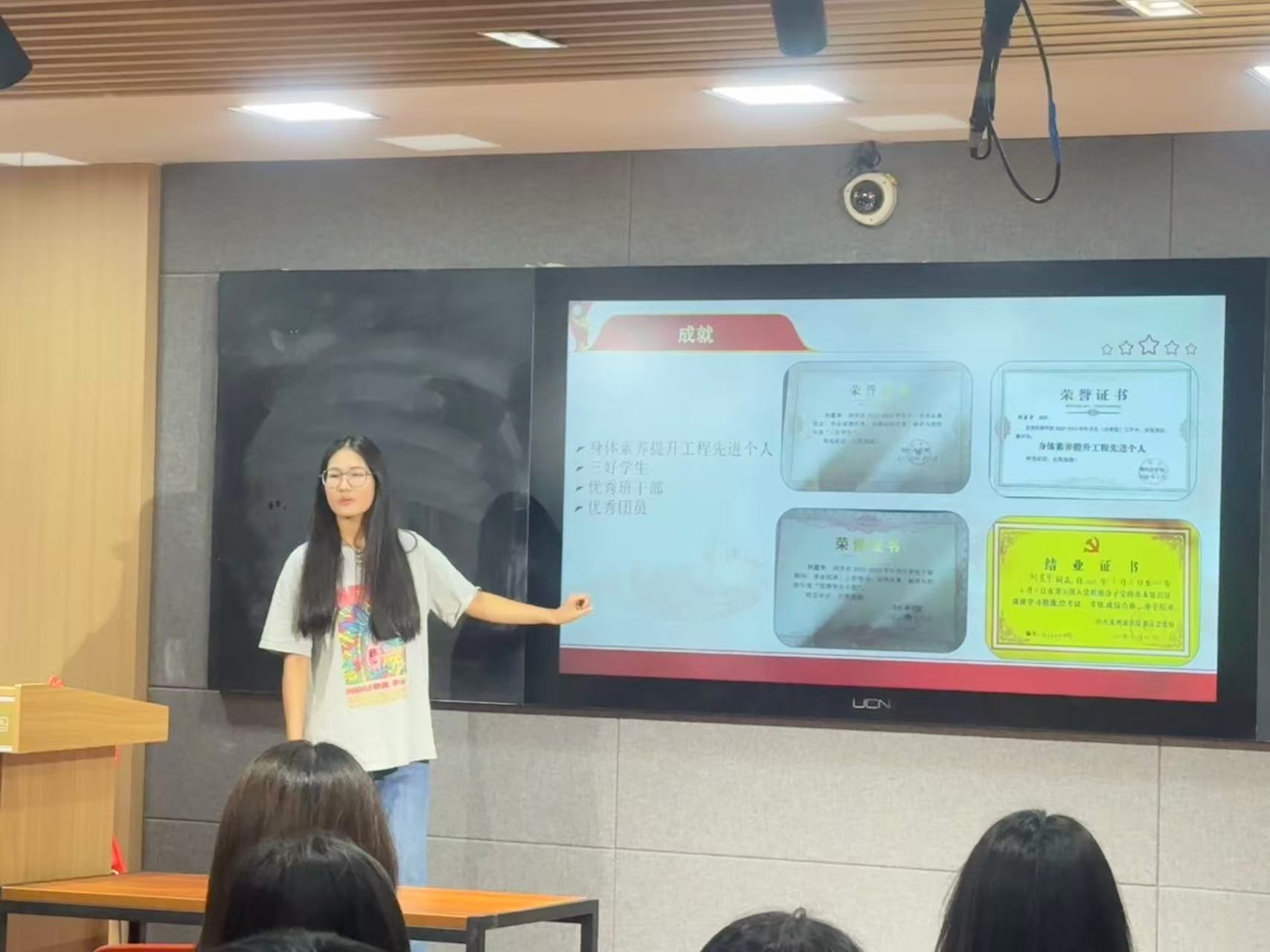 国家励志奖学金获得者刘星宇同学,她首先从学习、竞赛、社团活动、课余生活等多角度向同学们分享如何利用课余时间全方位提升自己;接着她从如何制定科学的学习计划,到怎样高效利用课余时间,都一一向学生们进行分享。同时她还分享了参与社会实践、社团活动的宝贵经验,以及在这些经历中的蜕变与成长。谈及获得励志奖学金的感受,她表示:“这份荣誉不仅是对我过去努力的肯定,更是一份鞭策。我会带着这份鼓励,继续在追梦的道路上奋勇前行,努力实现自己的人生价值,将来回报社会,帮助更多像我一样的人。