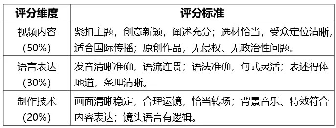 评委对提交作品进行打分,根据评委评分选出特等奖、一、二、三等奖和优秀奖。前5名作品将代表学校参加2025“外研社·国才杯”“理解当代中国”全国大学生外语能力大赛英语组短视频赛项省赛。