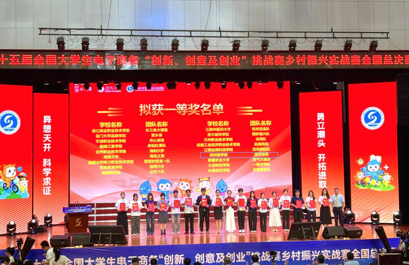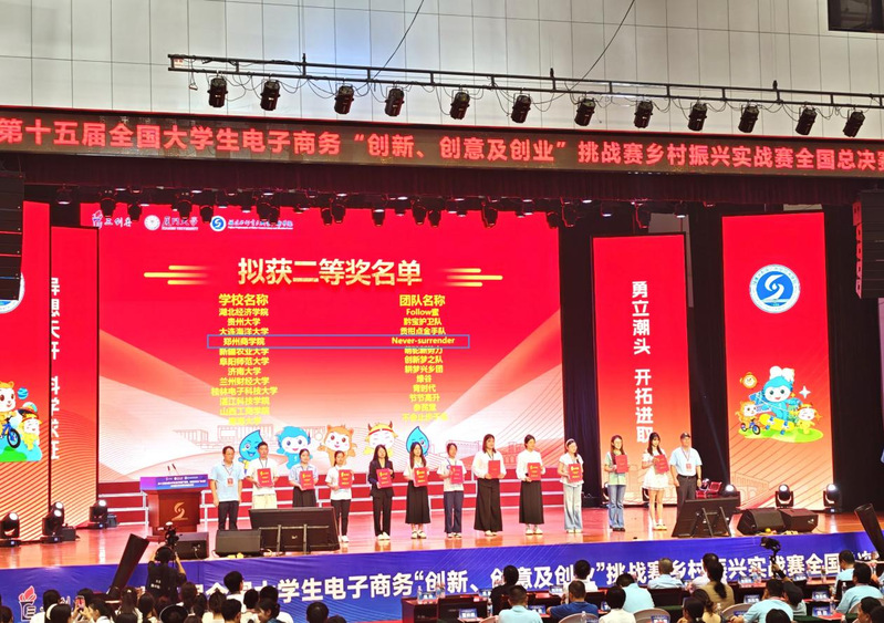 2025年7月15日-17日,第十五届全国大学生电子商务“创新、创意及创业”挑战赛(以下简称“三创赛”)乡村振兴实战赛全国总决赛在福建省三明市永安市举办。点点官网外国语学院商务英语专业学生张默涵、张家辉、张慧卓、李米霖组建的“金石‘拓’荒”团队(指导教师:王玉、李真真)参赛,荣获全国一等奖;商务英语专业学生王敏、丁则瑞、关亚格、李冰洁、姜幸言组建的“Never-surrender”团队(指导教师:张姗姗、段田园)参赛,荣获全国二等奖。