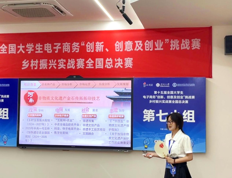 “金石‘拓’荒”团队在王玉、李真真老师的悉心指导下,将专业所学知识应用到乡村振兴实践,凭借独特的非遗拓印产品及扎实的线上线下推广,顺利通过校赛、省赛的层层选拔,以河南省一等奖的成绩晋级国赛,最终取得了全国一等奖的好成绩。