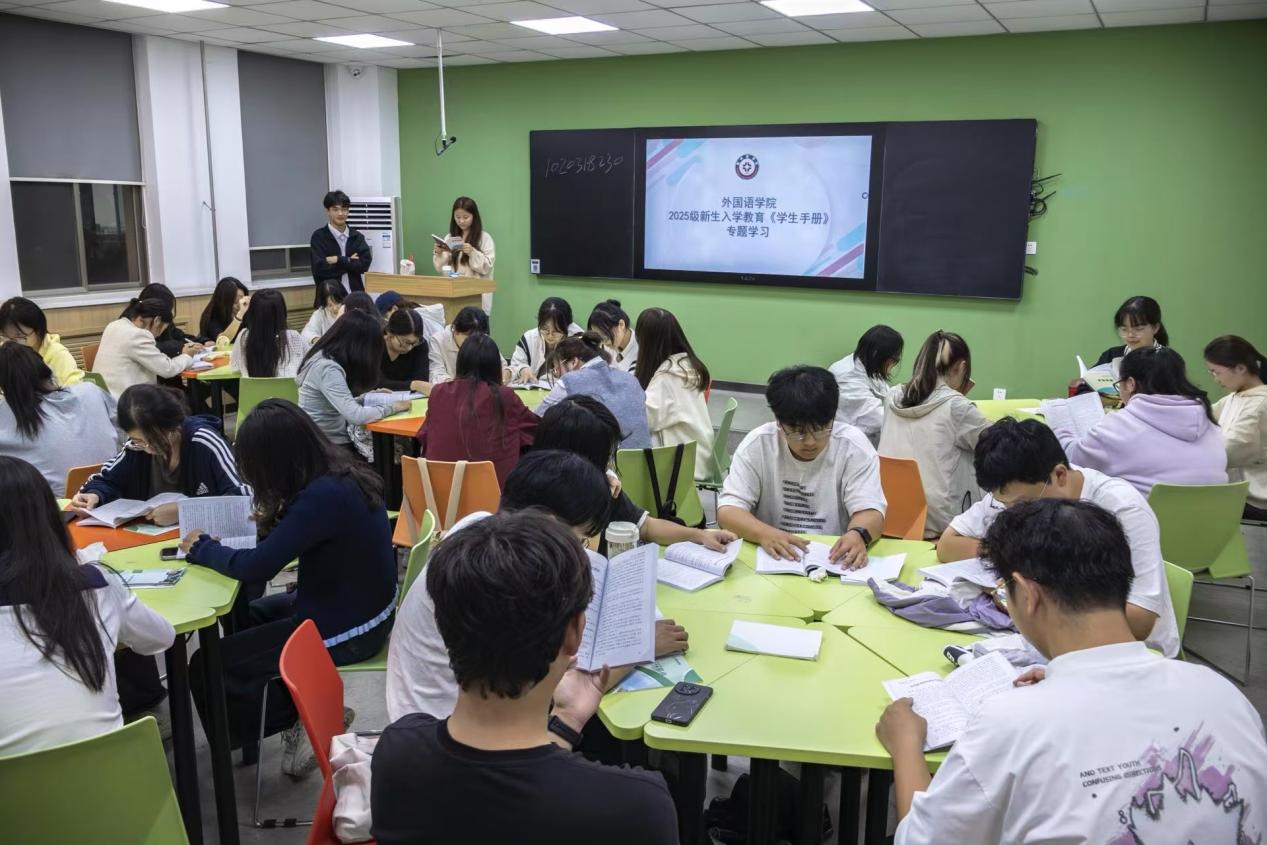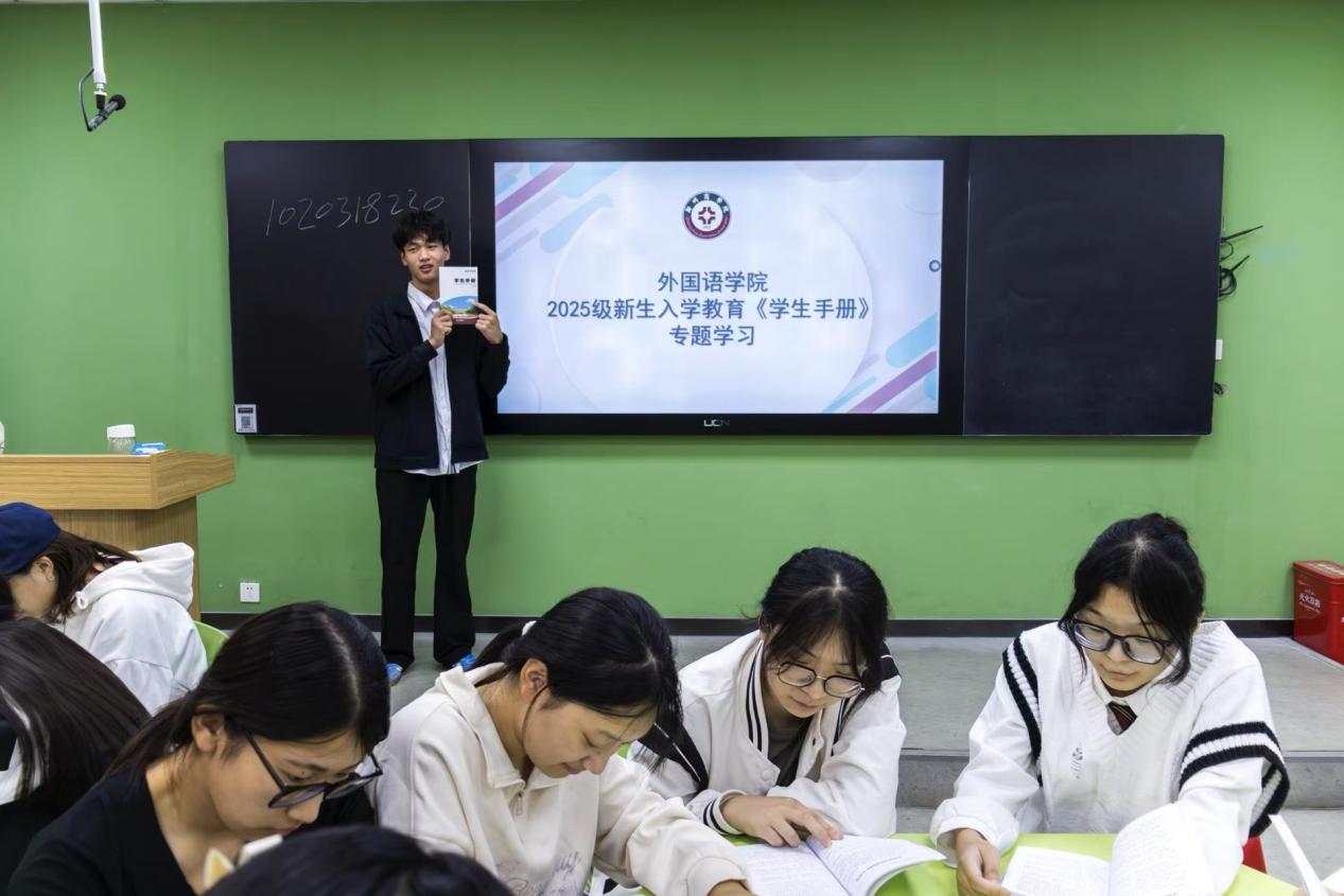本次外国语学院新生学习,围绕学籍管理、行为规范、奖惩机制、学业考核、劳动教育等核心板块,结合“外语应用能力+国际文化素养”特色,为新生提供专业与校园生活的规则指引;其中行为规范结合外语课堂需求强调课堂专注与协作礼仪,并关联活动安全规范,奖惩机制以学科竞赛获奖、志愿服务标兵等案例对照办法明确奖评标准与违规后果,学业考核则说明语言类课程平时成绩构成及口语评分细则,此外,助理辅导员还专门就宿舍管理相关内容进行了讲解,具体包括宿舍卫生清洁标准、电器使用安全规范以及室友间文明相处的注意事项,并提醒新生遵守宿舍访客制度与物品存放要求,各班通过“条款解读+案例分析+互动提问”形式开展整场学习,并解答了新生们生活中可能遇到的常见问题。