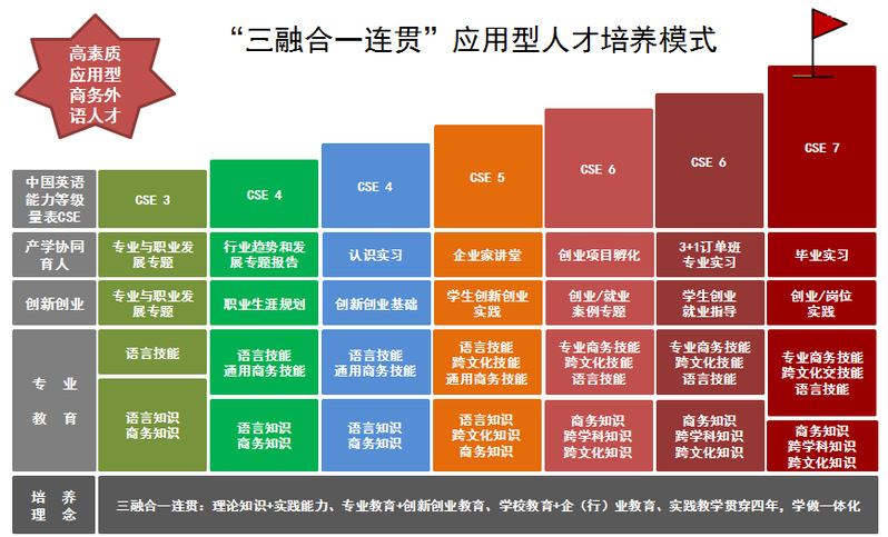 针对应用型人才培养目标,在深入研究学校“4+1+X”课程体系的基础上,参照《中国英语能力等级量表》和行业岗位能力要求,学院探索构建了外语专业在“三融合一连贯”的应用型人才培养模式,即理论知识教育与实践能力培养相融合,专业教育与创新教育相融合,学校教育与企(行)业教育相融合,实践教育贯穿四年,学做一体化。