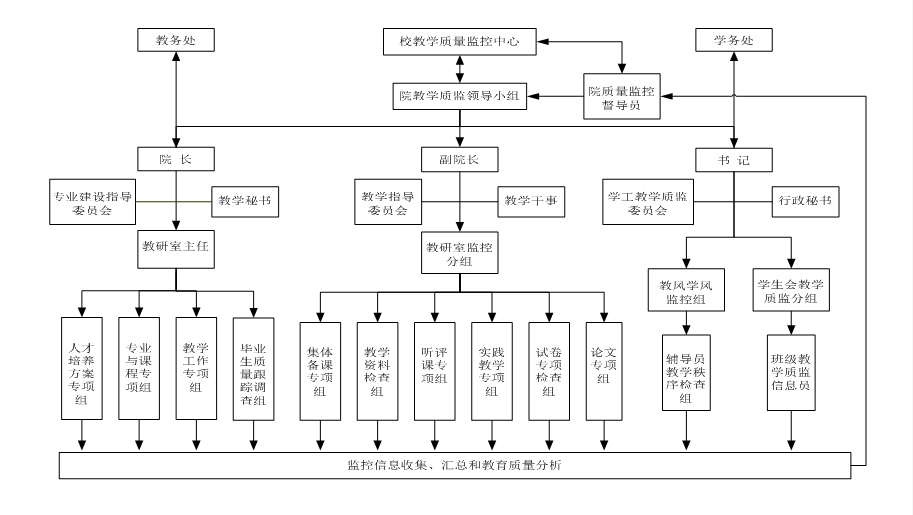为促进实现学院的内涵式特色发展,学院建立了覆盖教学全过程的“三线三级”质量监控体系,坚持“分工协作、责任到人”的工作思路,全方位开展教学、教风和学风的监控工作。针对监控中发现的问题,学院将采取“通知反馈、帮扶提升、书面提醒、通报批评”等方式督促相关教师和班级整改提高,确保学院教育教学质量的提升。
