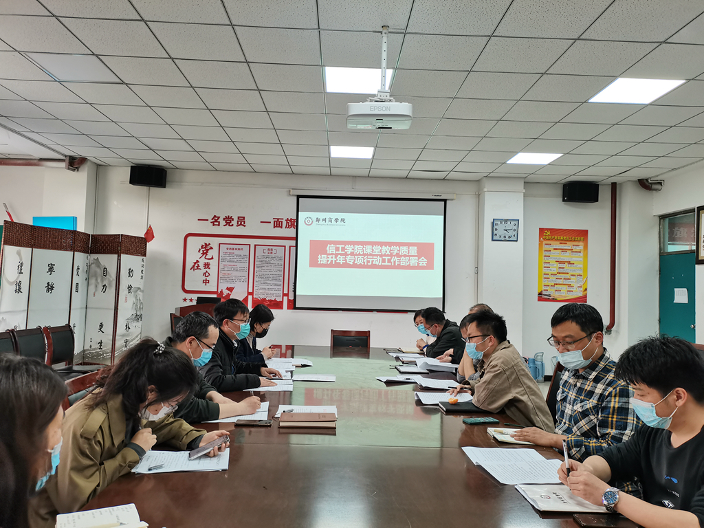 为深化教育教学改革,发挥好课堂教学的人才培养主渠道、主阵地、主战场的作用,全面提升学院课堂教学改革和育人水平。4月5日下午,信工学院在4104会议室召开了课堂教学质量提升年专项行动安排部署会,我院张伟华院长、院党委李帅书记、林海霞副院长、教学秘书王玉玮、各教研室主任以及相关老师参加了此次会议。