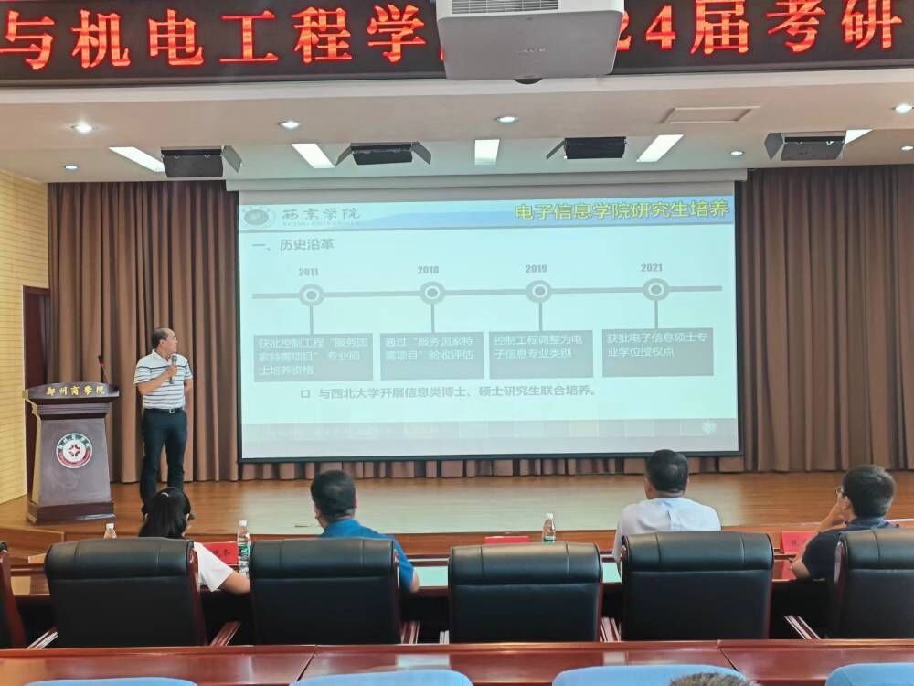 9月13日下午,西京学院计算机学院乌伟院长、电子信息学院郭建新院长、机械工程学院陈凯副院长一行三人,来到我院开展2024届研究生招生宣讲会。下午两点半,信工学院张晓冬院长、张伟华副院长和各教研室主任在图书馆五楼学术报告厅召开了2024届研究生招生宣讲会,信工学院相关专业近二百名学生参加了此次宣讲会。