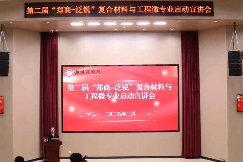为积极响应国家关于深化产教融合的政策号召,构建校企合作的新模式,推进复合材料与工程微专业建设,2025年3月20日,我院隆重举行第二届“郑商-泛锐”复合材料与工程微专业宣讲会。巩义市泛锐熠辉复合材料有限公司副总经理赵严博士,机电学院张晓冬院长,院党委杨茗涵书记,李深磊副院长,微专业班主任曹飞杨老师,助教李博老师等校企代表参加了本次会议。会议由机电学院党委组织委员杨瑞瑞老师主持。