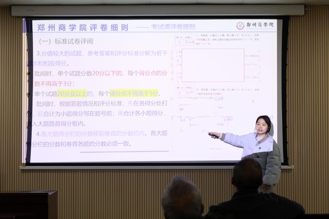紧接着,我院质量监控督导员张圆圆老师重点培训了《taptap点点评卷细则》,对考试课与考查课的评卷流程、评分标准及成绩管理进行了详细规定。细则要求评卷工作需由主讲教师组成评卷小组,集中流水评阅,每份试卷至少三位教师评阅并签名。同时,明确了评卷符号、合分复查、成绩更改等具体操作规范,确保评卷工作公正、透明。
