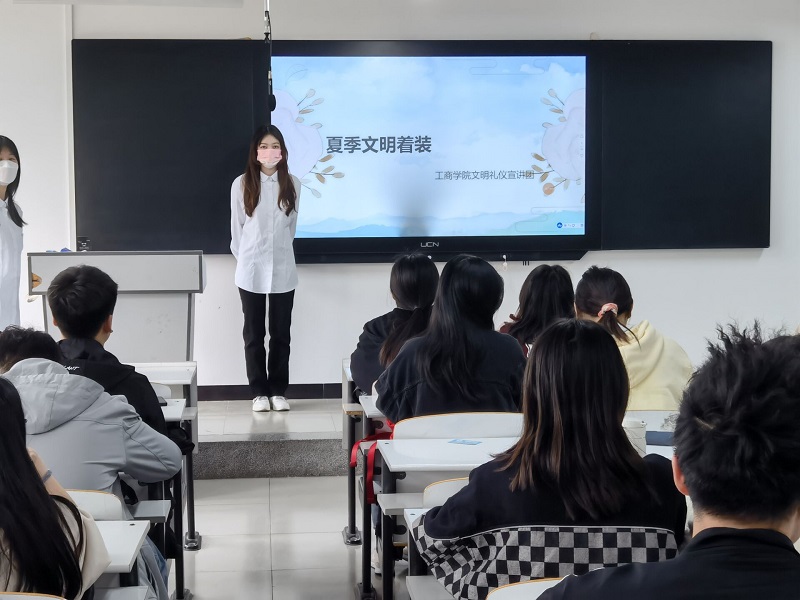 工商学院组织礼仪宣讲团进入各班级进行文明礼仪宣讲。礼仪是校园文化的重要表现形式,“一言一行见修养,一颦一笑见气质”,工商学院文明礼仪宣讲团旨在丰富大学生的礼仪知识,传播文明礼仪之风。从夏季文明着装礼仪、男女文明交往礼仪、宿舍文明礼仪、疫情防控文明礼仪等多个层面出发,倡导同学们践行文明礼仪规范,明白文明礼仪的重要性,争做具有高素质、高修养的大学生。在神态、肢体、语言、着装等方面指导并规范同学们的文明礼仪行为,进一步加强同学们的文明行为,增强同学们的文明意识,提高文明素养,培养自己成为讲文明懂礼仪的大学生。