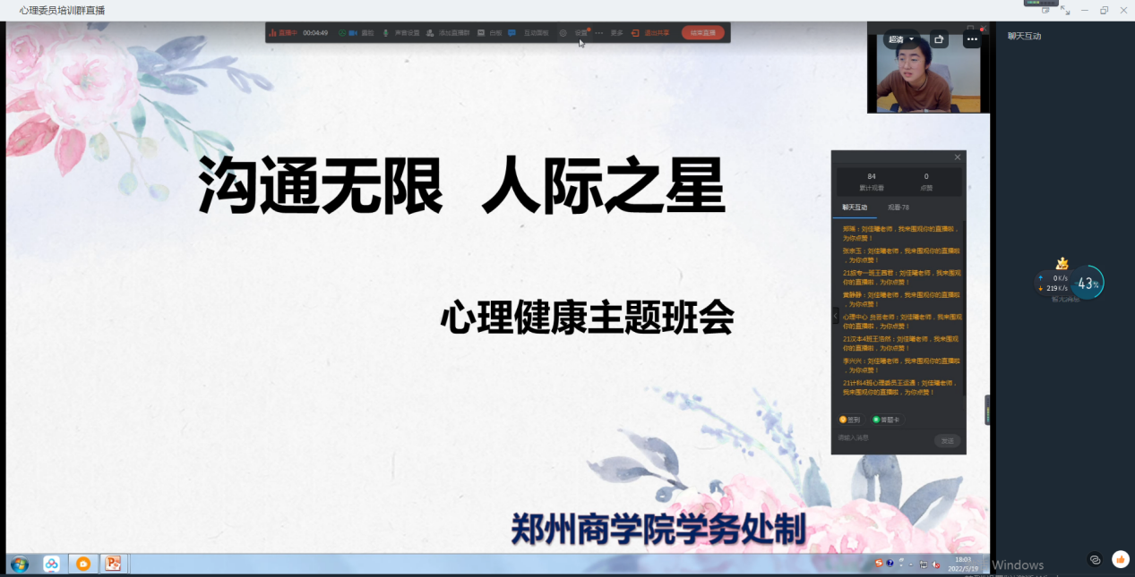5月19日下午,心理健康教育中心组织开展“沟通无限,人际之星”线上心理主题班会培训。本次班会培训由心理健康教育中心刘佳曦老师主讲,21级全体心理委员参加。