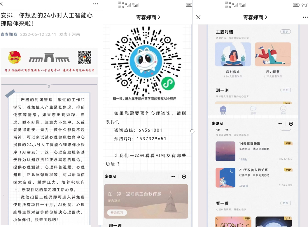 活动目的:疫情封闭管理期间,师生繁忙的工作和学习,难免使人产生紧张焦虑或抑郁低落等情绪。心理健康教育中心积极借助朗心科技,提供24小时人工智能心理陪伴小程序(AI密友),帮助同学们探索自我,缓解压力,培养积极向上、乐观豁达的学习和生活心态。
