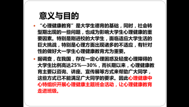 首先,刘老师简明地介绍了开展心理健康主题班会的意义、目的,紧接着开启了本学期第一次班会培训。以埃及文明的神话故事斯芬克斯之迷引入主题,详细地演示了如何通过自我意识测试,自画像活动以及播放视频等方式展开心理班会。随后,提出还可以通过戴高帽、多元排队等活动,增加趣味性,引导学生更好地认识自我。最后,刘老师对各位心理委员提出了要求,为表彰先进、激励后进,每次班会需提交班会记录及班会开展图片。