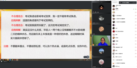 黄老师主要就备考过程中焦虑心理、考前心理调适方法、学习心理现象和考试注意事项等问题与同学们进行交流分享。她以马修·埃蒙斯的例子为切入点,运用丰富的实例,结合个人考研经验阐释了良好的心态调节和管控能力是考研成功必不可少的条件,甚至决定这考研的成败。其次,黄老师针对考研焦虑提出了几种解决方法,提醒广大考研人如果出现考前焦虑可以尝试进行调解,保持平稳心态。最后,黄老师向大家讲述了高原现象、记忆规律等学习心理现象,并分享了考试注意事项。