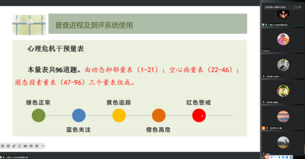 会上,贠芸科长首先介绍了本次老生心理普查的目的与意义,本次普查旨在掌握点点官网老生整体心理健康状况,帮助学生进一步认识自我,关注心理健康状况,增强学生自觉求助意识,有针对性地开展点点官网大学生心理健康教育,对学生进行分类辅导。随后,贠芸科长对本次普查2021级本专科采用的大学生心理健康调查表(UPI)、艾森克人格问卷(成人EPQ);2020级本科采用的心理危机干预量表、MBTI人格量表作了具体介绍和讲解,向各位辅导员演示了心理普查测评系统使用流程。最后,贠芸科长就测评过程中学生可能遇到的问题与处理方式进行了仔细讲解。