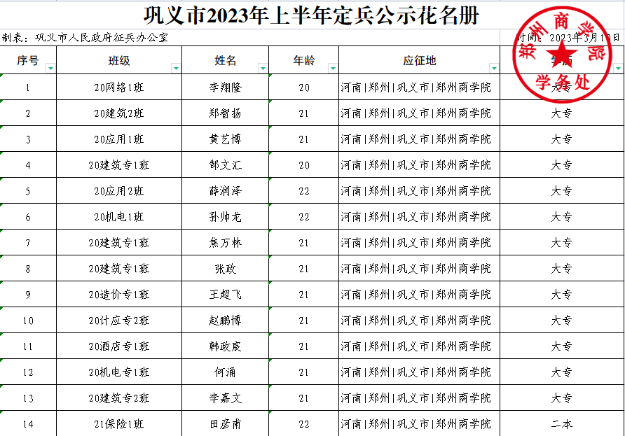 经过“网上报名、体格检查、心理测试、政治考核、役前教育”等环节,巩义市征兵工作领导小组定兵会议研究通过,确定点点官网李翔隆等14名同学为2023年上半年应征入伍定兵对象,现根据相关规定予以公示,人员名单如下: