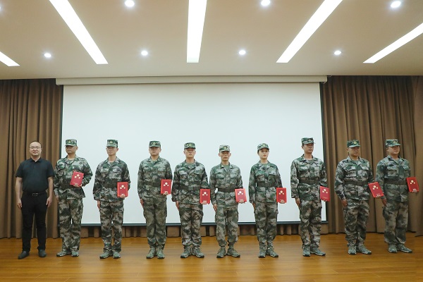 随后,信工学院卢宗浩作为教官代表进行表态发言,他承诺:一切从自我做起,认真履行一名教官应尽的职责,坚持各项规章制度,以兄长之情关心爱护大家,保质保量完成本次军训带训任务。