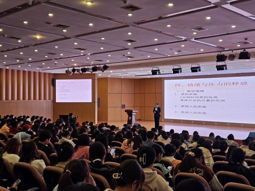 讲座伊始,许莹老师用风趣幽默的语言,点明讲座的主题“情绪与压力与管理”。随后,许老师分别对什么人更加轻松幸福、压力作用与压力源、情绪与压力释放三大模块进行了详细阐释,并就如何立足自身实际培养有利于身心健康的生活方式、如何通过适合自身的兴趣爱好和正面自我引导来有效应对和缓解压力等给予了针对性指导。许老师深入浅出、结合鲜活生动实例,通过互动等方式进行讲解,使得笑声与掌声贯穿全场。