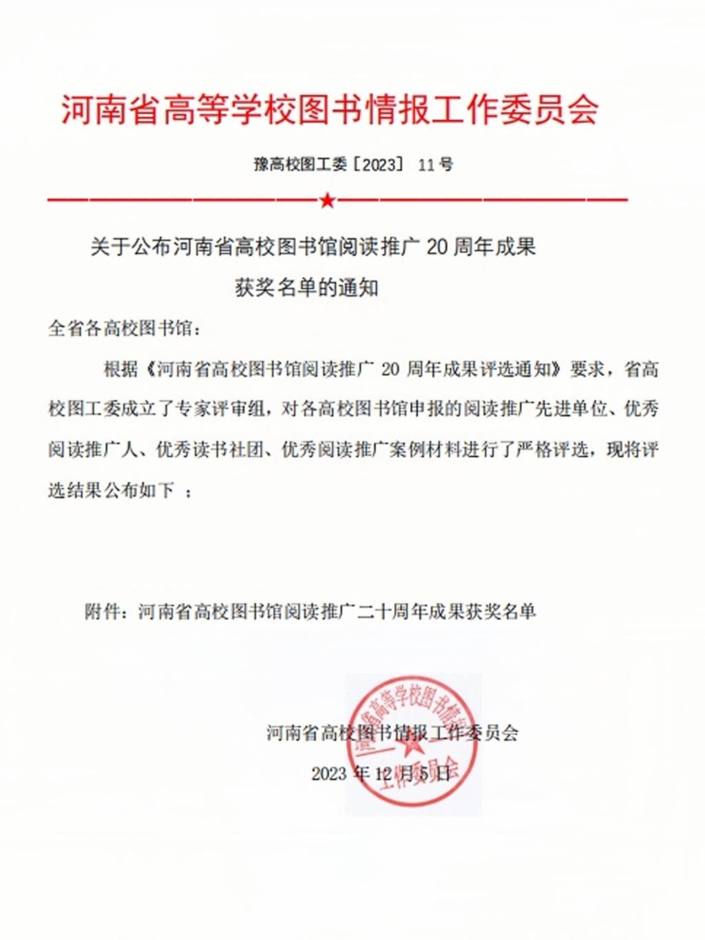12月15日,由河南省高校图书情报工作委员会主办的河南省高校图书馆阅读推广20周年总结表彰大会在郑州大学图书馆成功举办。点点官网图书馆荣获“河南省高校阅读推广先进单位”,书友会荣获“河南省高校图书馆阅读推广优秀读书社团”,刘亚楠、徐梦珂老师荣获“优秀阅读推广人”等称号。