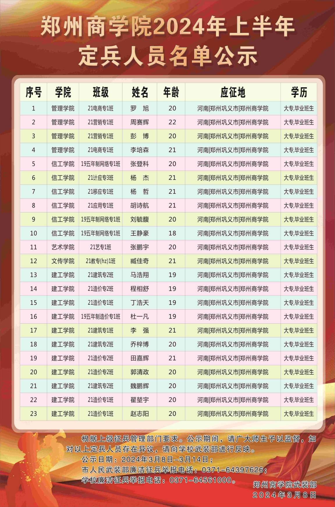 经过“网上报名、体格检查、心理测试、政治考核、役前教育”等环节,巩义市征兵工作领导小组定兵会议研究通过,确定点点官网罗旭等23名学生为2024年上半年应征入伍定兵对象,现根据相关规定予以公示,人员名单如下: