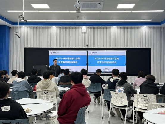 为进一步加强勤工助学岗位管理,倾听学生心声,畅通反馈渠道,更好的发挥勤工助学劳动育人功能,2024年3月15日,学务处劳卫科在三彩校区信工学院智慧教室组织召开勤工助学师生座谈会。