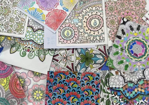 活动以简单轻松的破冰游戏“大风吹”拉开帷幕,随后,李云佳老师介绍了曼陀罗绘画的发展历程以及在心理学方面的应用,通过“冥想”的方法,引导同学们进入安静平缓的氛围,顺其自然地开启曼陀罗绘画。呈现曼陀罗图形,让同学们通过涂色在曼陀罗绘纸上表达心中的情绪、意向以及故事,将心理健康教育与艺术创作相结合,通过绘画的形式引导学生们表达自己的情感和想法。在绘画过程中,学生们不仅体验到了创作的乐趣,还学会了如何更好地调节情绪、缓解压力。活动最后,学生们纷纷展示自己的作品,并与同学们分享创作心得和感悟。