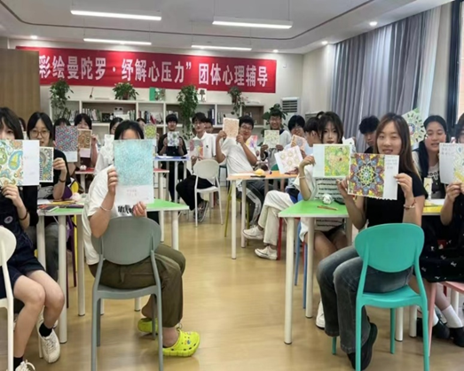 活动以简单轻松的破冰游戏“大风吹”拉开帷幕,随后,李云佳老师介绍了曼陀罗绘画的发展历程以及在心理学方面的应用,通过“冥想”的方法,引导同学们进入安静平缓的氛围,顺其自然地开启曼陀罗绘画。呈现曼陀罗图形,让同学们通过涂色在曼陀罗绘纸上表达心中的情绪、意向以及故事,将心理健康教育与艺术创作相结合,通过绘画的形式引导学生们表达自己的情感和想法。在绘画过程中,学生们不仅体验到了创作的乐趣,还学会了如何更好地调节情绪、缓解压力。活动最后,学生们纷纷展示自己的作品,并与同学们分享创作心得和感悟。