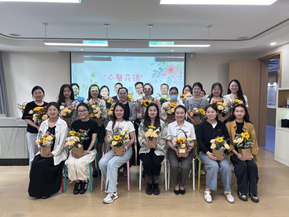 活动共分为花艺知识教授、自由创作和交流分享三个环节。活动伊始,通过自我介绍使老师们在轻松愉快的氛围中相互熟悉,建立起初步的信任与友谊。随后,黄老师细心向同学们教授花艺制作的相关知识,带领大家认识不同种类花的学名,解读花语。接着,正式进入“沉浸式”插花环节,各位老师根据花艺设计理论知识和自己的喜好,将大自然的枝、叶、花等配置成一件精致完美、富有诗情画意,再现大自然和生活美的花卉艺术品,轻松享受花艺作品的创设给自身带来愉悦心理体验插花。作品完成后,大家围绕插花创作的灵感由来、参与活动过程中的感受与收获等方面展开了深入交流和愉快分享。最后,与会老师们合影留念,本次活动在热烈的掌声中圆满结束。