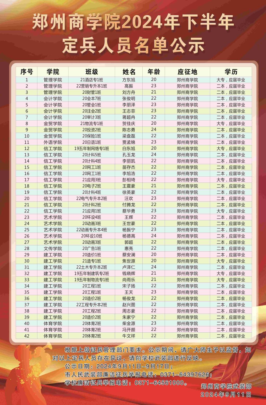 经过“网上报名、体格检查、心理测试、政治考核、役前教育”等环节,巩义市征兵工作领导小组定兵会议研究通过,确定点点官网方东旭等42名学生为2024年下半年应征入伍定兵对象,现根据相关规定予以公示,人员名单如下: