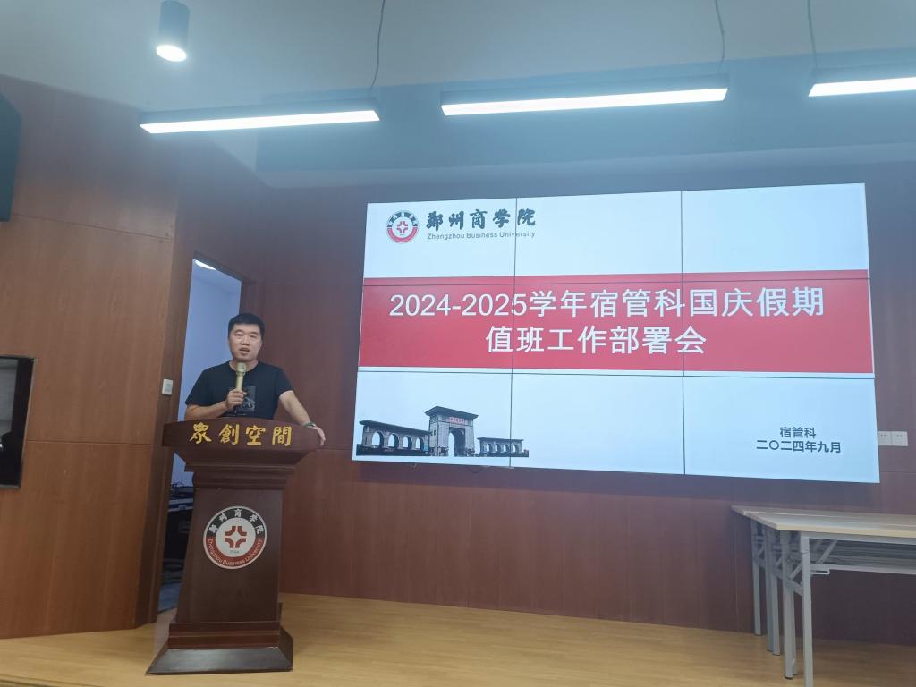 为切实做好国庆假期学生宿舍的管理与服务工作,学务处宿管科于2024年9月29日上午在学生事务中心三楼“牛顿路演厅”召开国庆假期值班工作部署会议。宿管科全体人员参加此次会议,会议由宿管科科长贺萌主持。