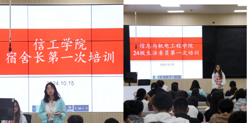 为进一步拓宽学生干部的工作思路,丰富其实践经验和工作方法,促进信工学院学生干部队伍建设,10月15日,信工学院在三彩校区信工大楼JT101教室召开24级宿舍长及生活委员工作培训会。信工学院学生会成员、23级生活委员代表、全体新生宿舍长及生活委员参加此次培训会。