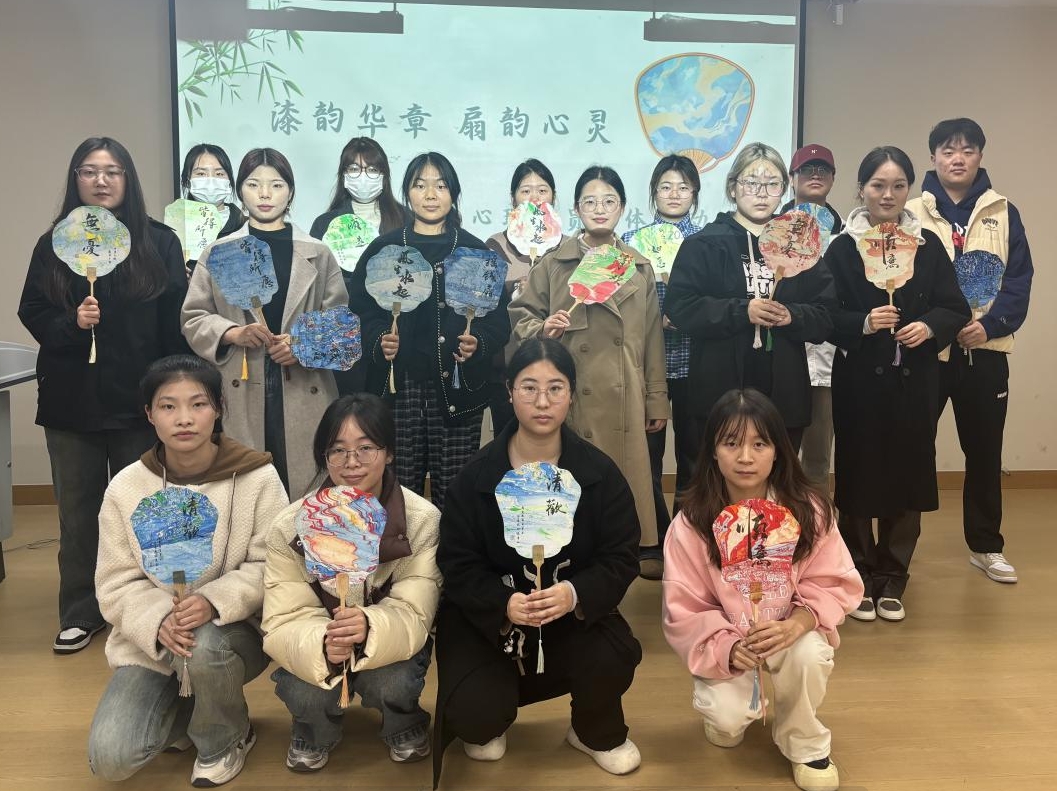 活动在一片温馨和谐的氛围中拉开序幕。姬老师首先带领大家进行了简短而有趣的热身活动,通过轻松的游戏和互动,让每一位参与者都迅速融入了这个充满活力的集体。紧接着,活动进入了核心环节—漆扇制作讲解。姬老师为大家详细讲解了漆扇的历史渊源、制作工艺以及文化意义。随后同学们纷纷拿起工具,开始了漆扇的制作之旅。