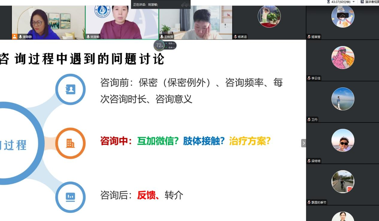 11月20日下午心理健康教育中心采用线上线下相结合的形式组织开展了专兼职心理咨询师交流会。此次会议旨在提升学校心理咨询服务的专业性与效率,增进咨询师之间的沟通与协作,为全校师生提供更加优质的心理咨询服务。此次会议由心理健康教育中心黄静静老师主持,全体校内外专兼职心理咨询师参会。