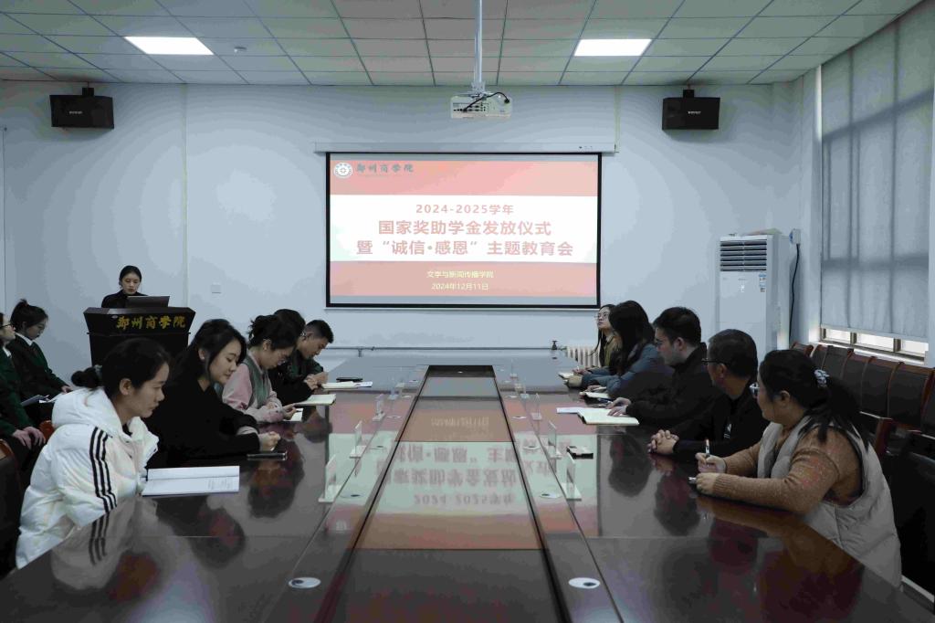 12月11日下午,文传学院在自力楼216会议室举行2024-2025学年国家奖助学金发放仪式暨“诚信·感恩”主题教育会。会上,资助专员对学院的资助工作进行了总结,并为国家奖学金、国家励志奖学金和国家助学金学生代表颁发奖牌,最后由团委书记王凯做总结性讲话。此次会议是扎实推进立德树人的根本任务,是实现资助育人的重要举措。