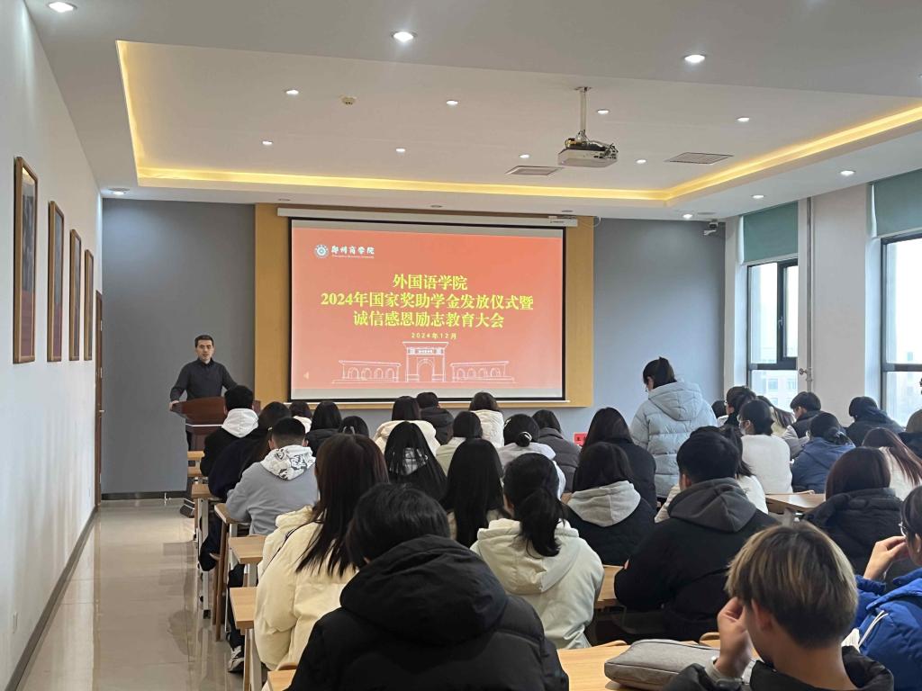 资助温暖人心,为解决学生的实际困难,激励优秀学子向上向前发展,12月9日上午,外语学院于图书馆五楼多功能厅召开2024年国家奖助学金发放仪式暨诚信感恩励志教育大会。外语学院始终高度重视学生资助工作,不断提升资助育人成效,此次奖助学金发放仪式,不仅对受助学生的努力给予了充分的肯定,使受助学生感受到了温暖与关爱,还激励了广大学子勤奋学习,努力进取。