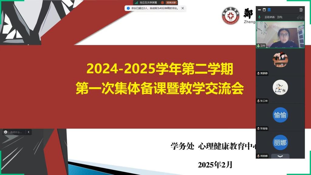 为进一步提升教师课堂教学能力,推动心理育人实效,保障新学期心理健康教育工作顺利开展,2月14日晚,心理健康教育中心通过线上会议组织开展了新学期第一次集体备课暨教学交流会。心理健康教育教研室全体专兼职教师围绕教学安排、教学方法、课堂管理等展开学习交流,为新学期教学工作充电蓄能。