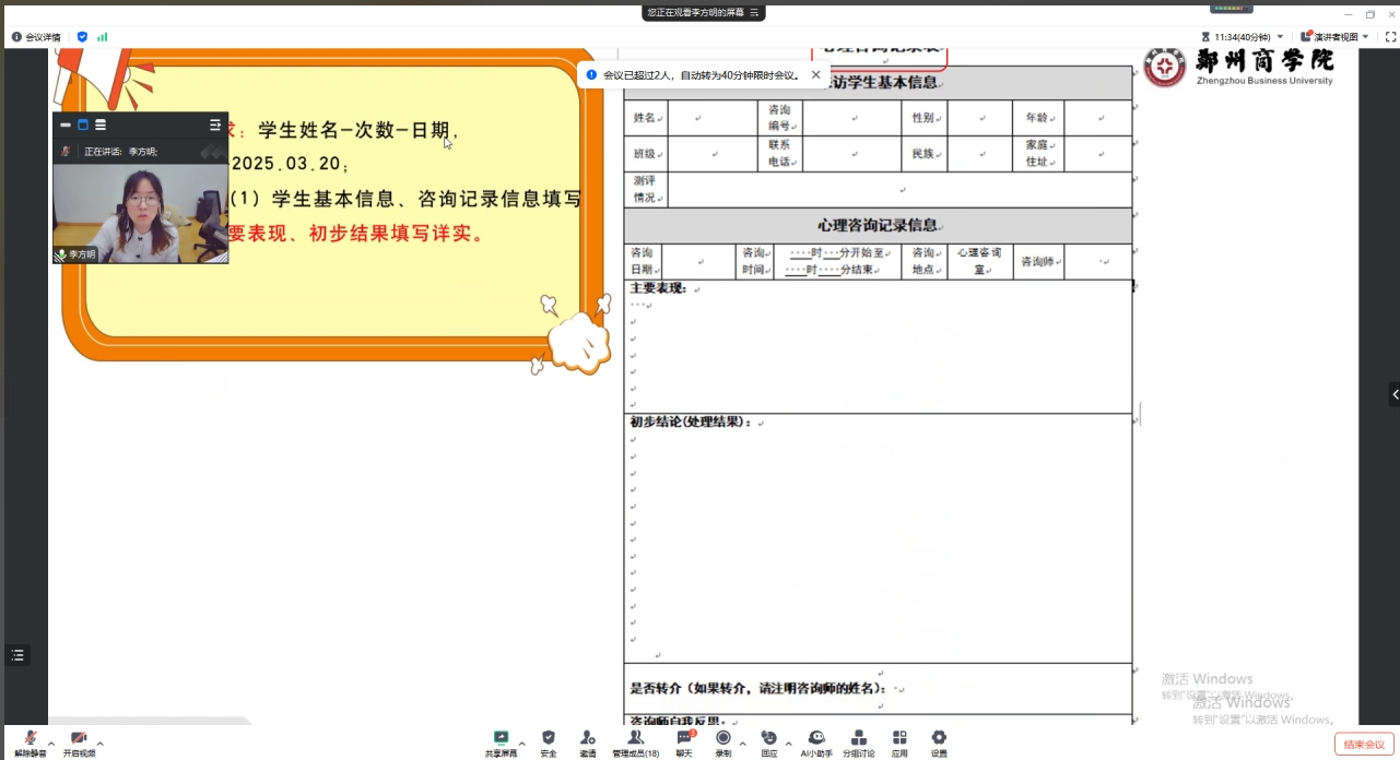 为进一步提升心理咨询服务质量,强化专兼职心理咨询师的职业道德与专业素养,规范学校心理咨询流程,3月20日下午,心理健康教育中心采用线上的形式组织召开了专兼职心理咨询师咨询伦理与原则工作培训会。此次会议由心理健康教育中心科长刘思楠主持,全体校内外专兼职心理咨询师参会。