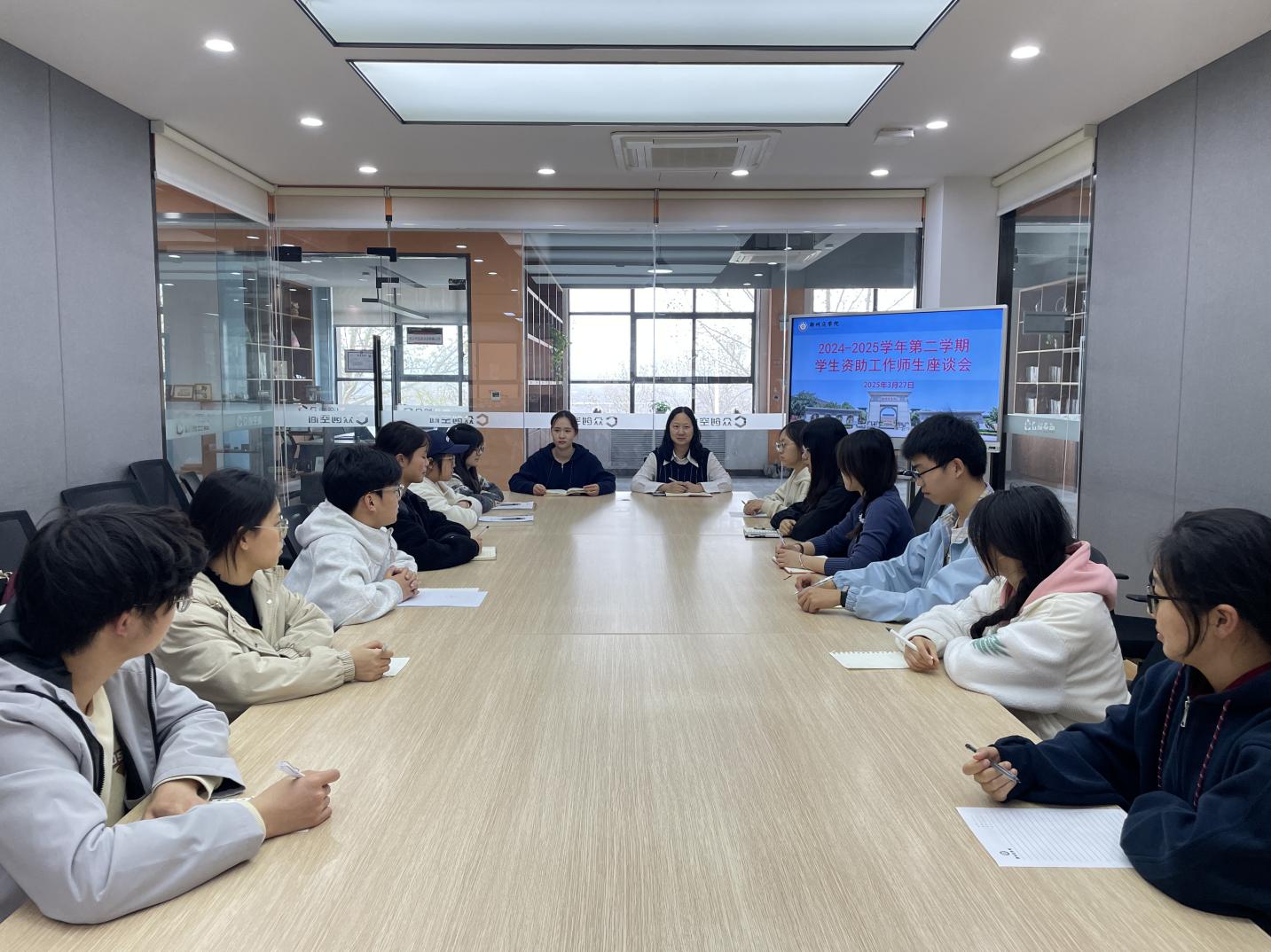 3月27日下午,学务处学生资助管理中心在学生事务服务中心二楼会议室召开了本学期学生资助工作师生座谈会。学生资助管理中心王晶晶科长、陈梦雪老师和二级学院学生代表以及校资委会学生代表参会。
