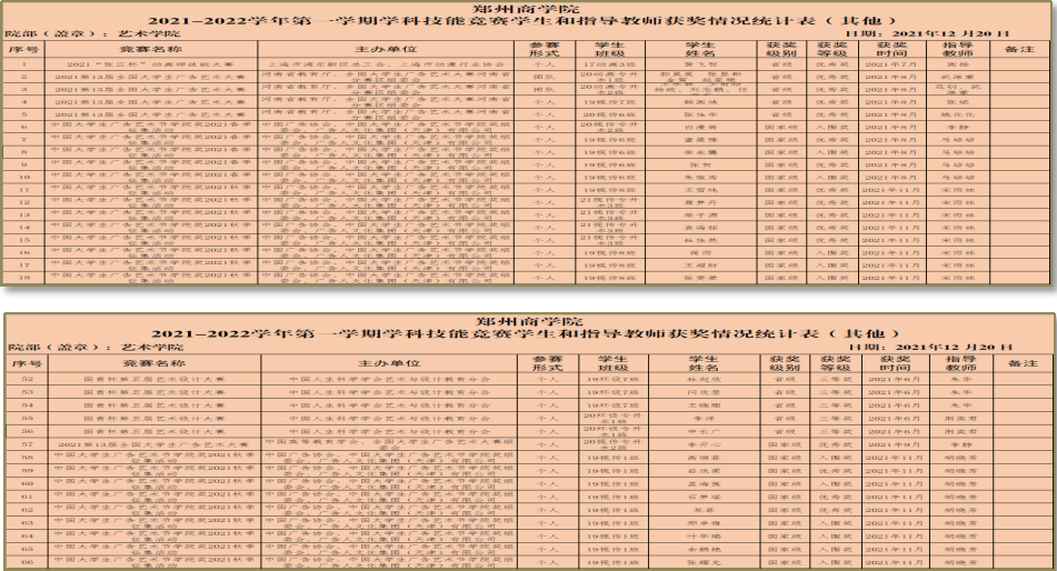 坚持团学服务教学平台建设,在本年度专业竞赛中我院团员青年共荣获省级、国家级奖项66项,其中在国青杯第五届艺术设计大赛中荣获一等奖6人、二等奖8人、三等奖8人;在中国大学生广告艺术节学院奖2021秋季征集活动中,荣获优秀奖14人,入围奖27人。