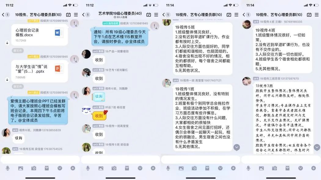 21级心理委员在心理部统筹安排下开展心理健康教育主题班会5次,19、20、21级心理委员向辅导员及心理部月汇报8次。针对班级出现心理异常学生做到早发现,早干预,及时有效的解决学生的心理困惑,帮助问题学生健康成长。