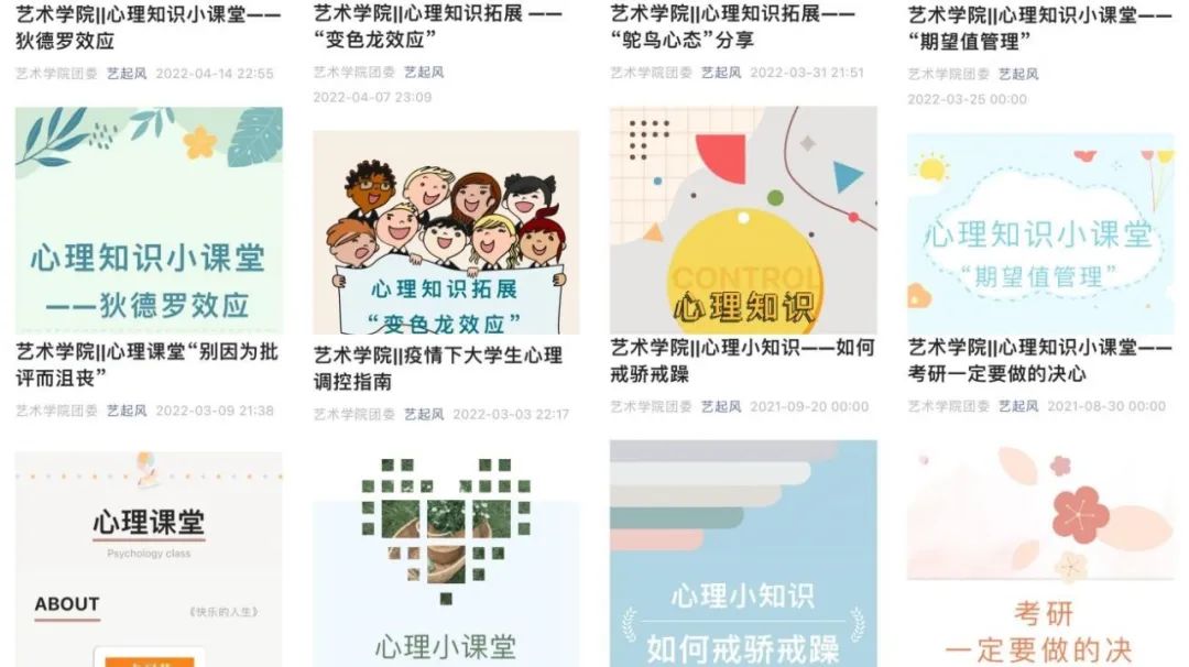 二级心理辅导站利用学院微信公众号艺起风开设心理知识小课堂专栏,共推送心理健康知识16期,对学生进行线上心理健康知识宣传普及,加深同学们对心理健康的认识和理解,学会自我调解。