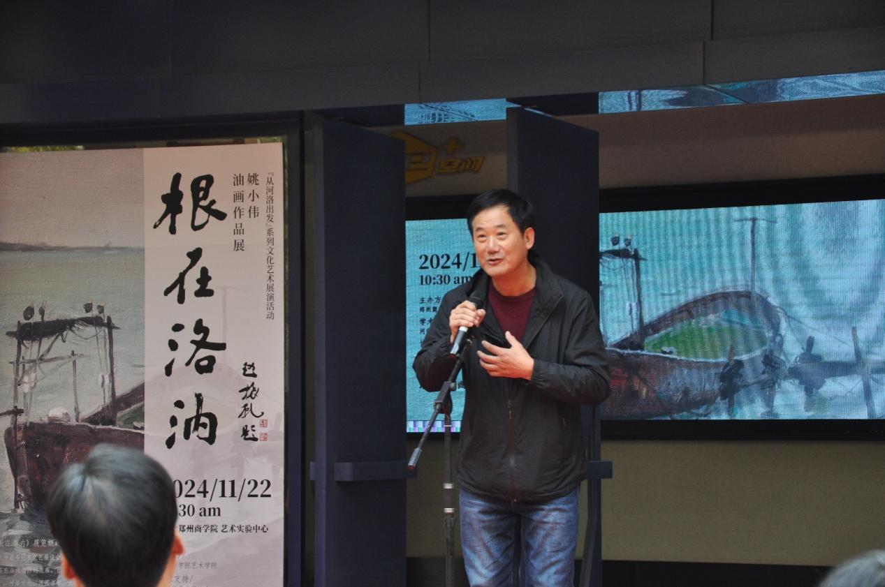 河南省艺术教育协会副会长赵振乾教授代表参展画家的母校致辞,他肯定了参展画家姚小伟老师近四十年的创作成果,是河南油画艺术的代表性画家,并鼓励taptap点点发挥河洛文化发祥地的优势,为高校交流和河洛文化发展搭建平台。