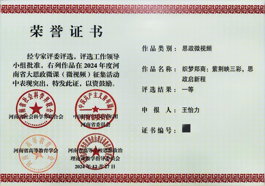 近日,河南省社会科学界联合会、中国共产主义青年团河南省委员会、河南省高等学校思想政治理论课教学指导委员会联合发布《关于公布2024年度河南省大思政微课(微视频)征集活动评选结果的通知》(豫社科联字〔2024〕19号)。艺术学院在此次活动中共斩获4个奖项,其中思政微视频1项、课程思政微课2项、大学生主题微视频1项,其中一等奖2项、二等奖2项。