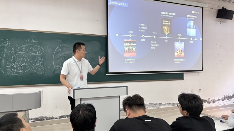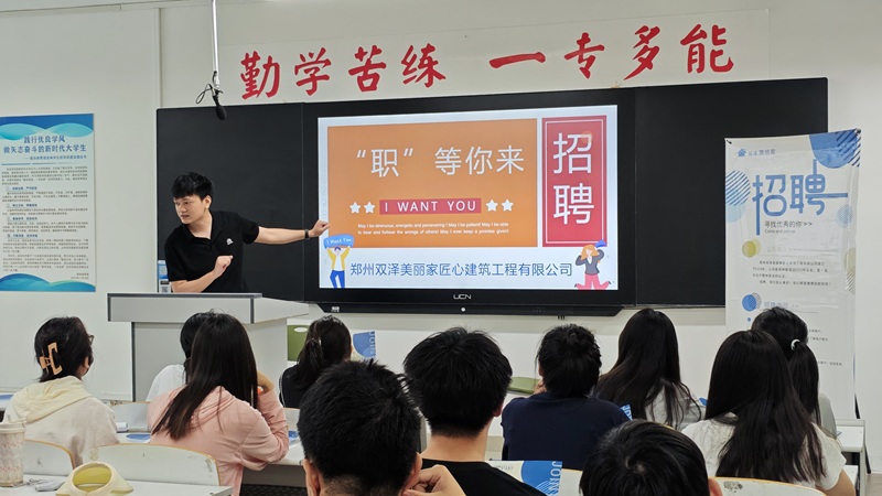 随后,企业招聘会宣讲环节正式开启。杭州乐传荣耀科技有限公司、河南枭影影业、巩义市吉家美装修装饰有限公司、郑州双泽美丽家匠心工程有限公司、郑州品宅电子商务有限公司金螳螂家等多家企业依次进行宣讲。各企业代表通过精彩的PPT展示、生动的案例分享和视频播放,详细介绍了企业概况、发展前景、业务范围、企业文化、人才需求等内容。杭州乐传荣耀科技有限公司人力资源经理王华磊着重介绍了企业完善的培训体系和广阔的晋升空间,以及针对实习生的特别计划,旨在帮助实习生快速成长为企业骨干;河南枭影影业的创始人尚冠羽则通过展示公司的明星项目,展现了企业在行业内的领先地位和创新实力,吸引了众多同学的目光。