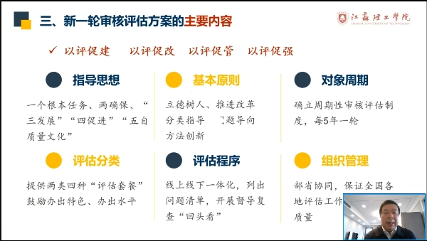 本次讲座由江苏理工学院原党委书记、教育部普通高等学校本科教育教学评估专家委员会委员朱林生教授主讲,朱教授以新一轮审核评估的背景与创新、指标体系的核心意蕴、评估过程与注意事项三个方面作为本次讲座的主要内容。朱教授指出,新一轮审核评估主要是对上一轮审核评估的继承与发展,突出立德树人、科学分类、质保理念、减负增效、结果使用和评估方法创新等特点;各高校在审核评估过程中要紧扣“主动服务高等教育改革发展大局”和“对标中央教育评价改革总体方案”两条主线,深化理解指标体系的核心意蕴,认真谋划自评自建、线上评估、入校评估和评估整改四个阶段的相关工作。