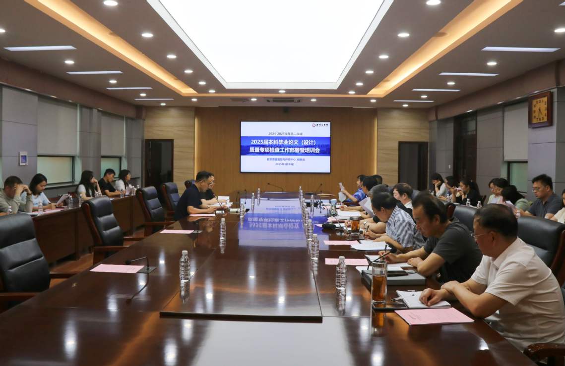 为强化本科毕业论文(设计)过程管理和监控,不断夯实毕业论文(设计)规范与质量,持续加强本科教育教学审核评估教学材料准备工作,5月14日下午,质评中心在行政楼第一会议室组织召开2025届毕业论文(设计)质量专项检查工作部署暨培训会议。质评中心主任、教务处实践教学科科长、校级教学督导组成员、二级学院质监员、论文负责人、中心办公室成员参加会议,会议由质评中心主任李斯主持。